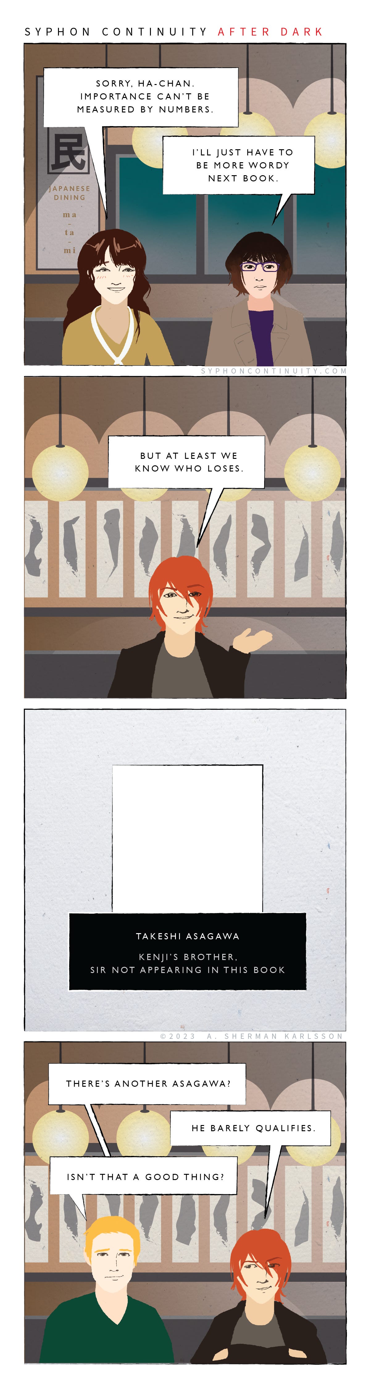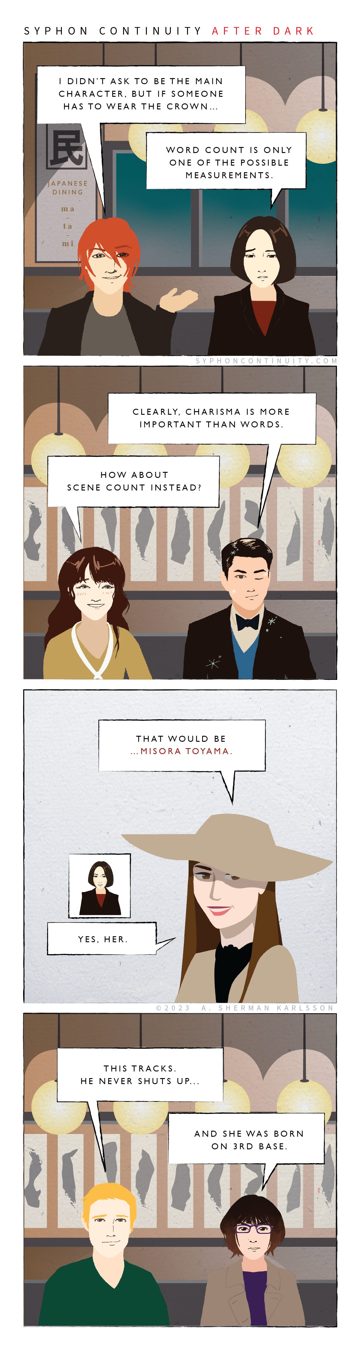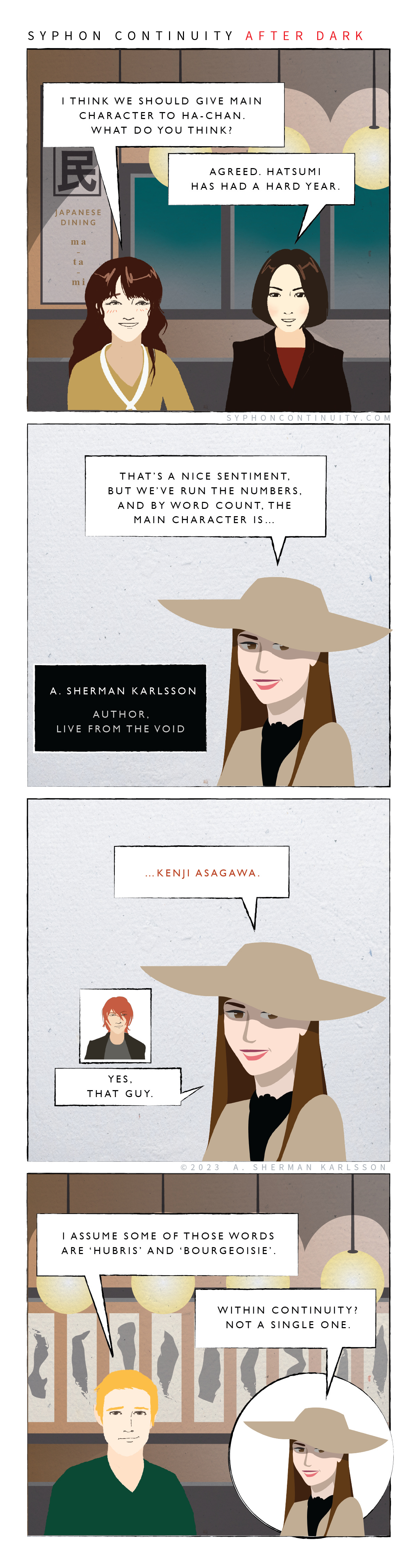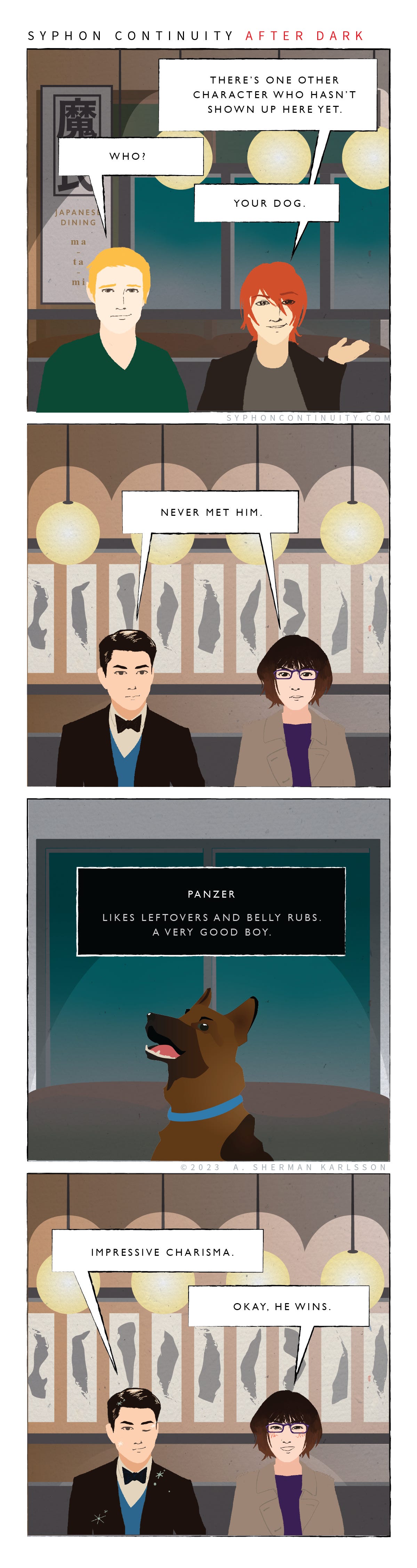 Comic: After Dark Syphon Continuity After Dark 40-44 And our winner is... A. Sherman Karlsson 20 Aug 2023 — 1 min read Share Hey, looks like we're outside continuity over here. Yeah? Strip 40Strip 41Strip 42Strip 43Strip 44